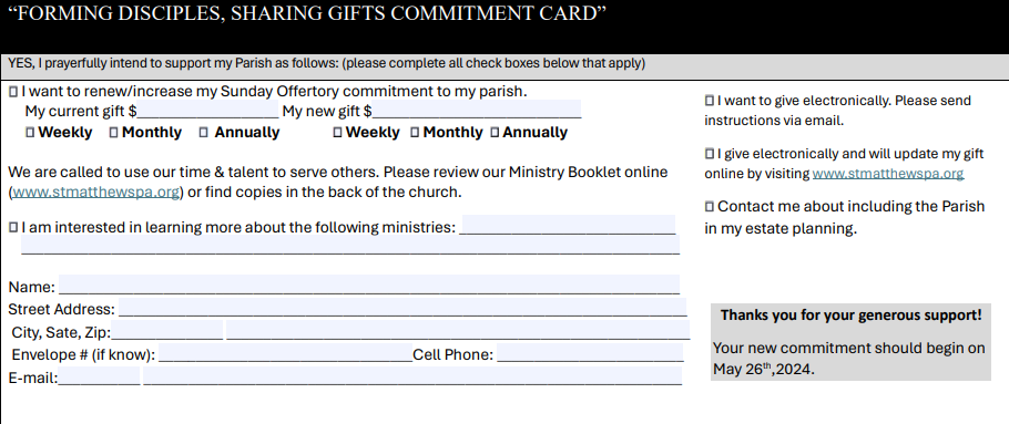 Please prayerfully consider how you will offer your gifts of time and talent as you read through this booklet and reach out to the contact person(s) or complete the tear-off to help in our parish mission to spread the Kingdom of God through Worship, Word, Service and Community.