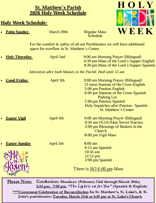 Saturday: after 8:00am Mass & 3:00-3:45pm